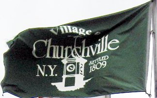 The flag is green, with "Village of Churchville, N.Y., Settled 1809" written around the image of a clock tower.