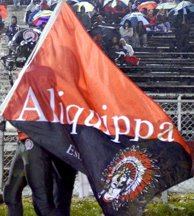 The flag, bisected diagonally, has red on top, black on the bottom, and "Aliquippa" printed in white letters along the diagonal equator. It includes "Est. 1894," the date the city (then a borough) was incorporated, in white letters, and a silhouette of an American Indian in a chief's headdress, the Aliquippa High School mascot, in a bottom corner.
