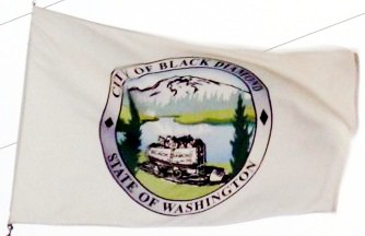 The flag of the City of Burien, Washington, is white with city logo on it. The Burien City Council adopted the official logo and three colors for the City of Burien at a council meeting on February 8, 1993. The logo was developed through a contest involving school students." - information by Phyllis Dickey, City of Burien.