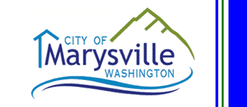 The flag of the City of Marysville, Washington, is white with city logo on it. At the end of the fly 5 vertical stripes - blue-white-black(?)-white-blue, the last is much wider then the others. Information and photo of the flag thanks to Doug Buell, Public Information Officer.